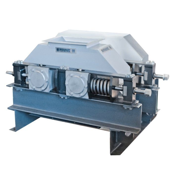 The roll crusher is a housing with the guides installed on it. The bearing units where the shafts with the rolls secured are installed move by guides. . One of the rolls is pressed by the spring units that prevent the crusher from breakage in case of uncrushable objects ingress. The spring compressive force provides for the required crushing force. The position of the second roll is provided by the jaw adjustment units.